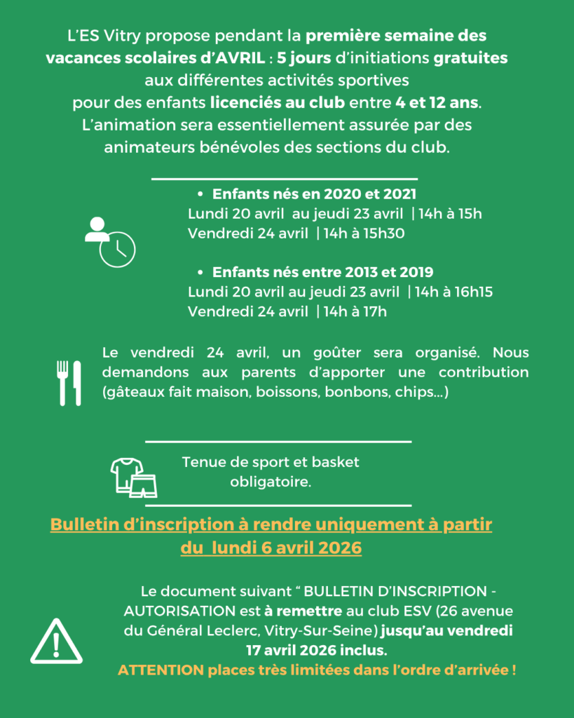 Rejoignez-nous et partagez avec nous le plaisir du sport, le respect et la convivialité. Ensemble, faisons grandir l’ES Vitry !